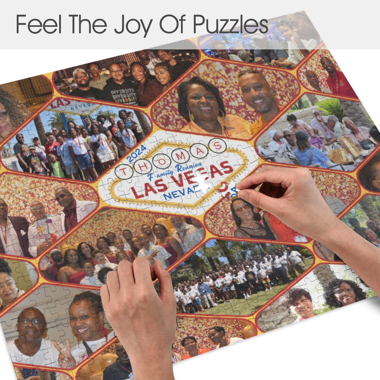 A personalized puzzle featuring pictures from the Vegas 2024 family reunion offers a delightful way to reminisce about the joyous moments shared with loved ones. Assembling it becomes an engaging activity that not only brings the family together but also strengthens bonds while reliving precious memories.